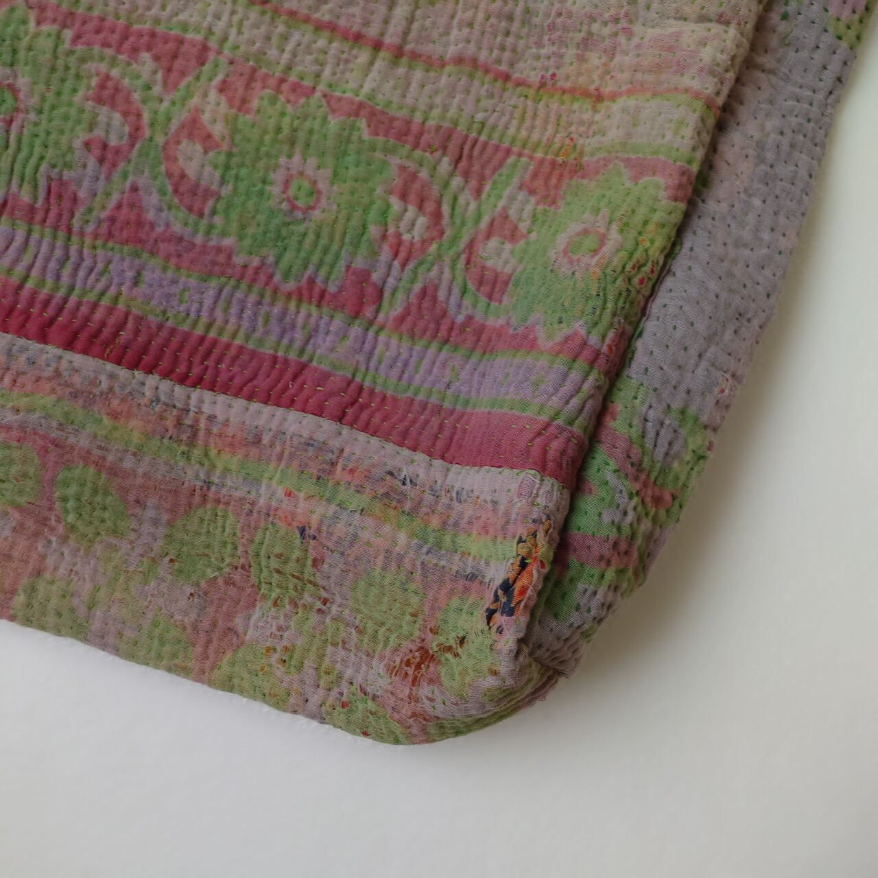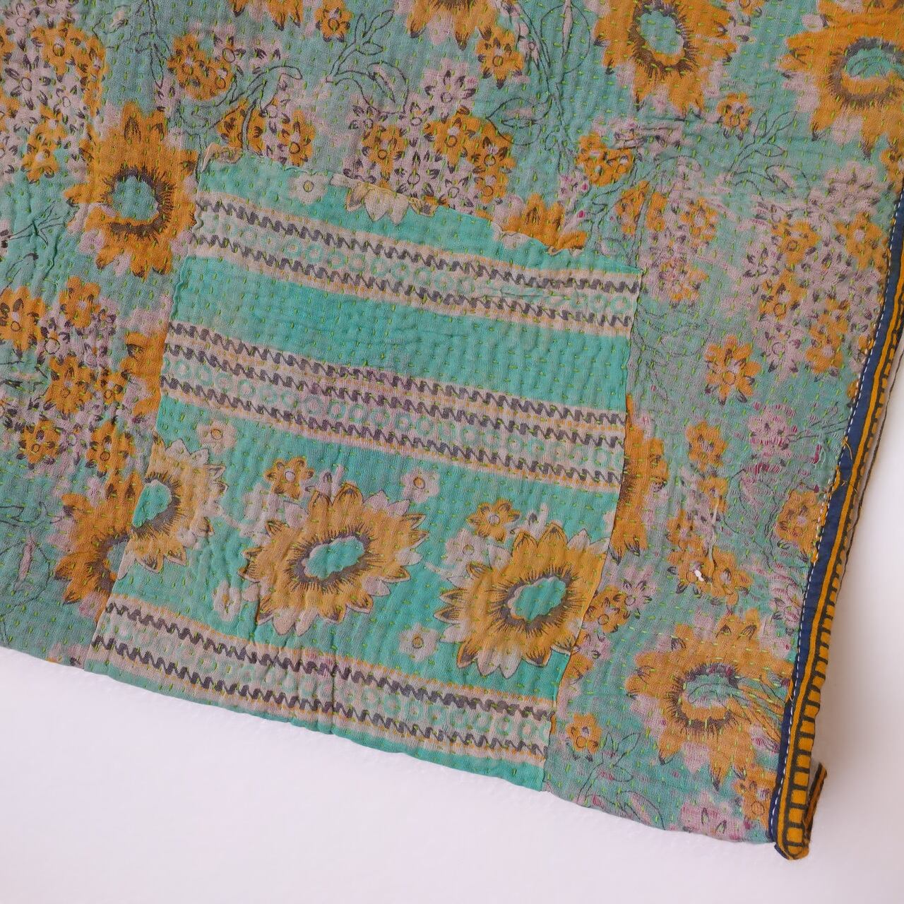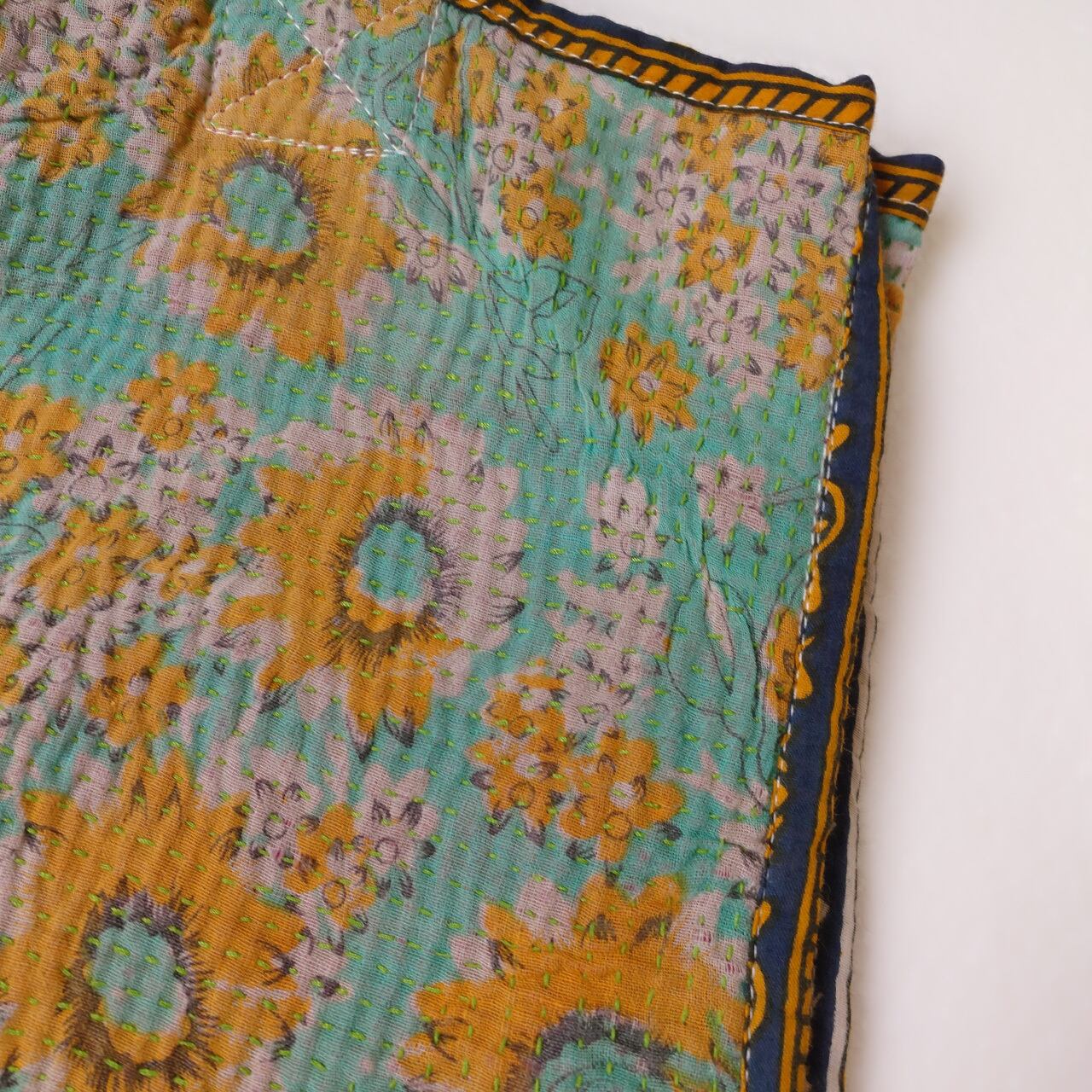 カンタ刺繍(Kantha)は、インドやバングラデシュで伝統的に行われている刺繍技法です。この技法では、古布を重ね合わせて、色とりどりのパッチワークに美しい刺繍を施します。「カンタ」という言葉自体が「刺す」という意味を持っており、その名の通り布に刺繍を施すことで知られています。